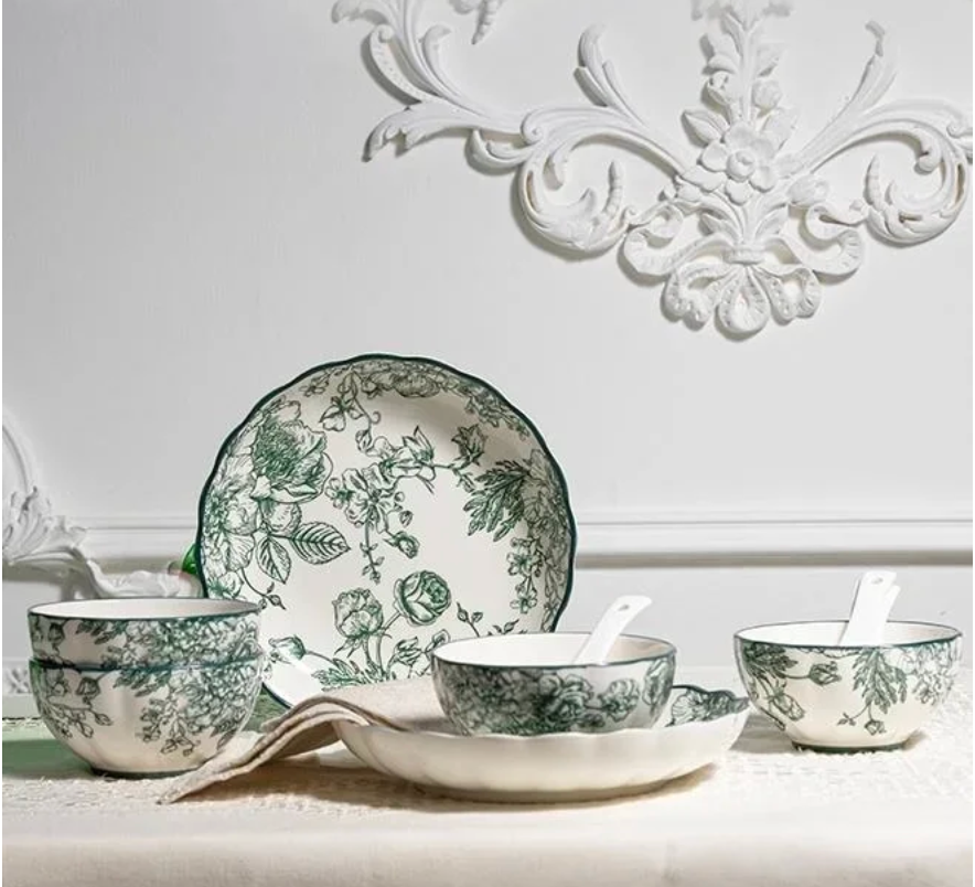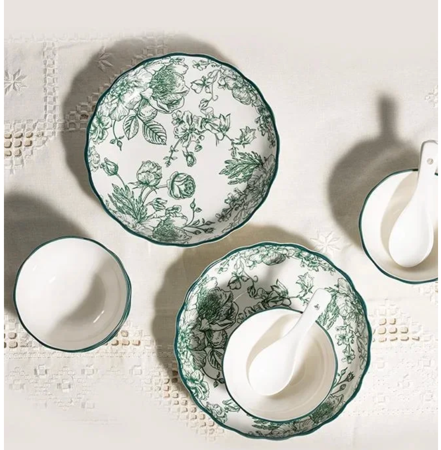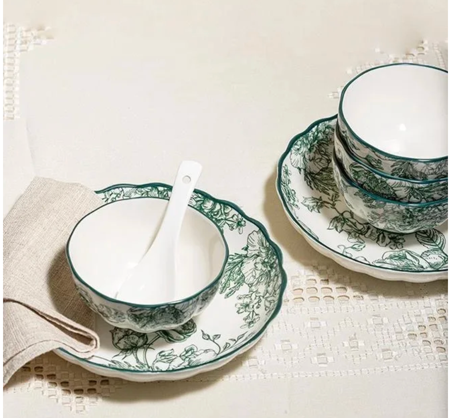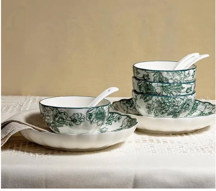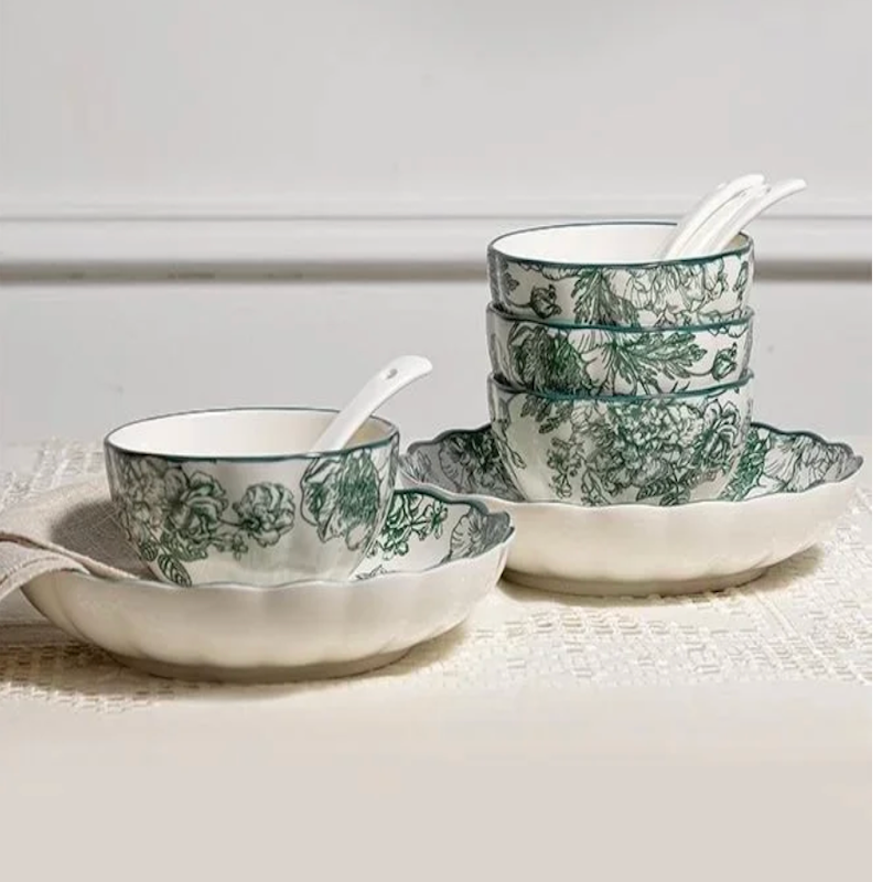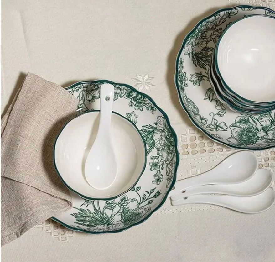The set includes 4 bowls, 4 plates, 4 ceramic spoons, and 2 serving bowls — thoughtfully designed for serving soups, noodles, snacks, and appetizers in style. Its versatile design makes it perfect for family gatherings, festive occasions, or gifting, bringing effortless sophistication to any table setting.