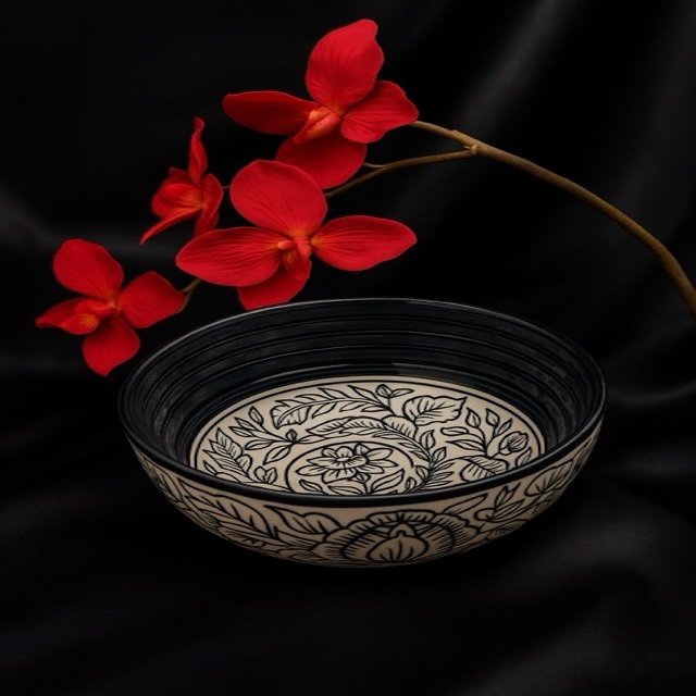 Bring home the timeless charm of Kalamkari artistry with a modern luxury twist. The Kalamkari Noir Dinner Set is crafted in premium ceramic with striking black-on-ivory floral motifs, designed to make every dining experience feel elegant and exclusive.