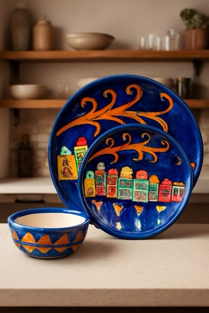 Make mealtime fun and creative for your little ones with the Bright Hut Kids’ Dinnerware Set, specially curated to bring joy, color, and imagination to every bite. Each piece is hand-painted by skilled artisans, featuring cheerful hut motifs in vibrant yellow, green, and red on a deep blue base — a playful design that sparks curiosity and delight at the table.