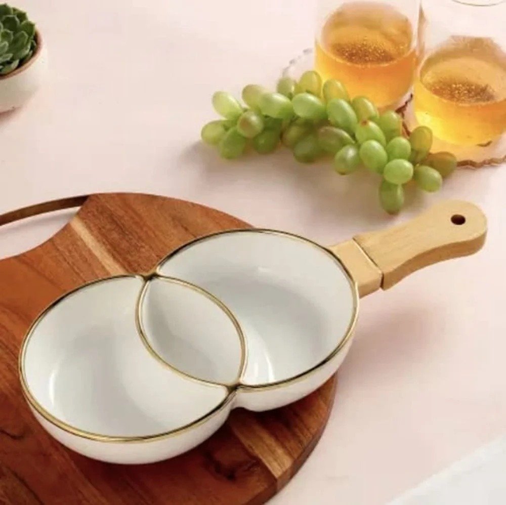 Bring effortless style to your table with the ChicNibble Ceramic Set, a modern duo snack server designed for those who love to entertain in style. With its smooth ceramic finish, elegant divided design, and natural wooden handle, this set makes snacking chic, organized, and picture-perfect. Perfect for chips & dips, nuts & candies, sauces, or evening munchies its not just serveware, its a conversation starter.