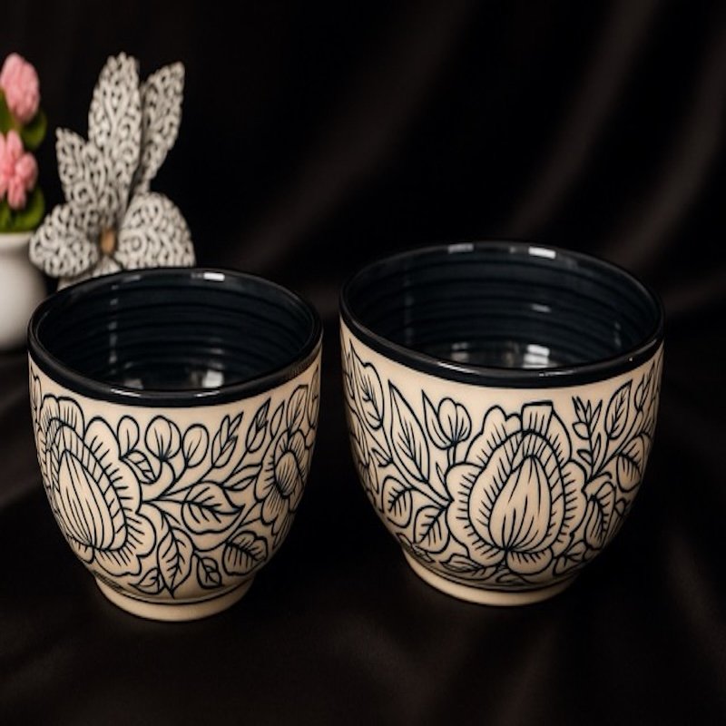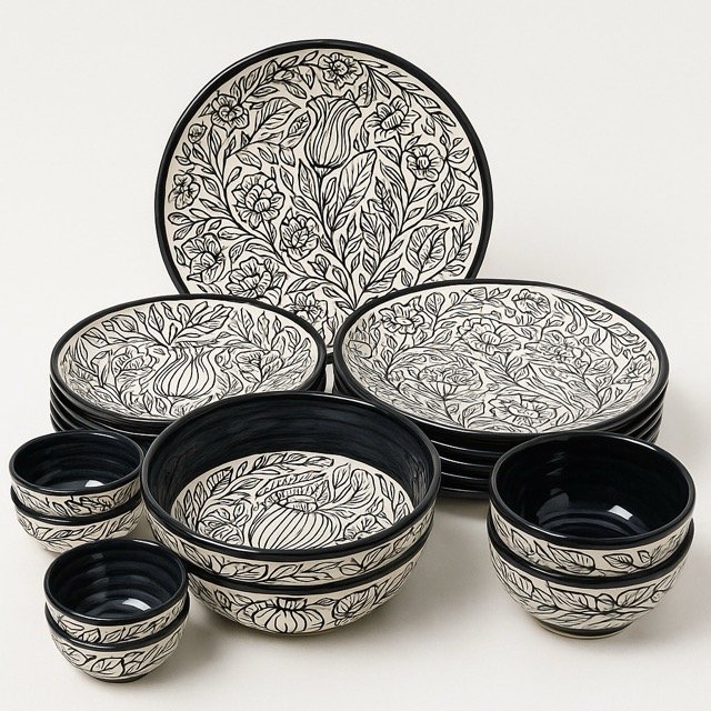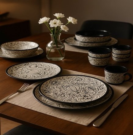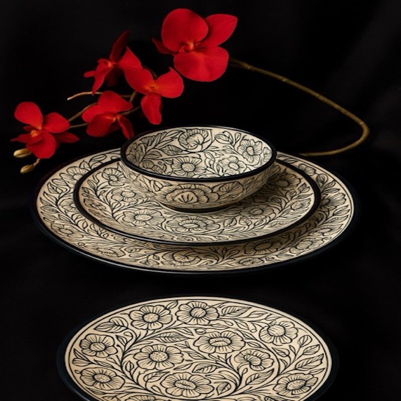 Bring home the timeless charm of Kalamkari artistry with a modern luxury twist. The Kalamkari Noir Dinner Set is crafted in premium ceramic with striking black-on-ivory floral motifs, designed to make every dining experience feel elegant and exclusive.