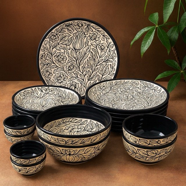 With 6 dinner plates, 6 quarter plates, 6 bowls, and 2 serving bowls, this complete 20-piece set is perfect for family dinners, festive hosting, and luxury gifting. Unlike generic dinnerware, its rare Noir-inspired Kalamkari design makes it a collectible piece of table art, blending Indian heritage with contemporary sophistication.