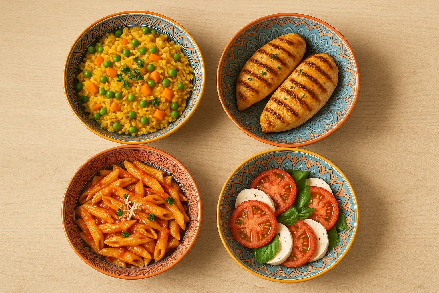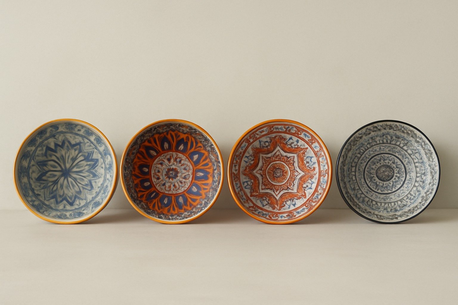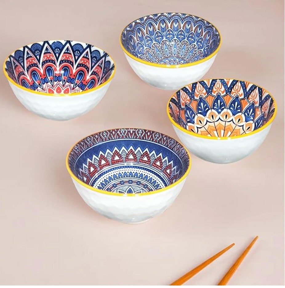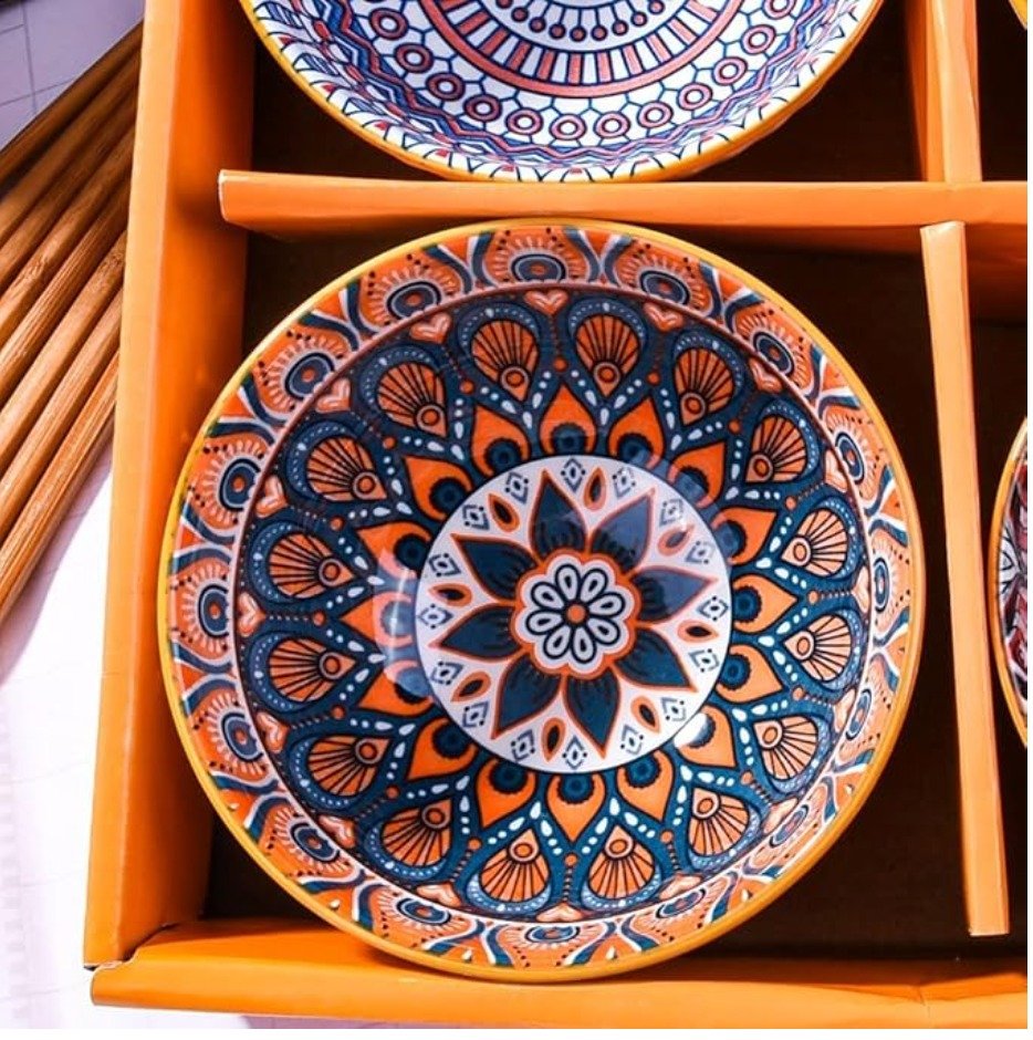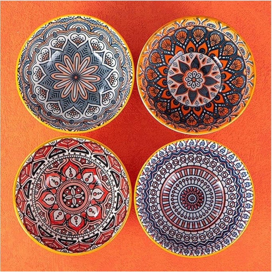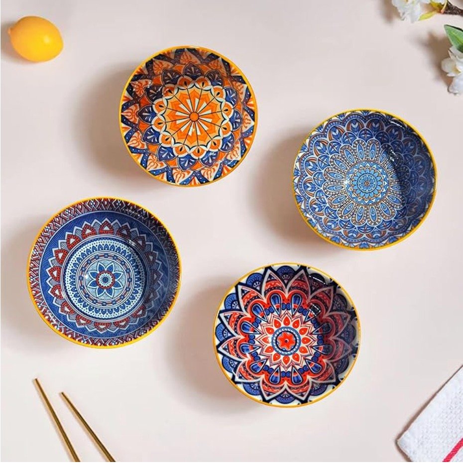 • 4 Printed Ceramic Bowls (Each with a Distinct Mandala Pattern).